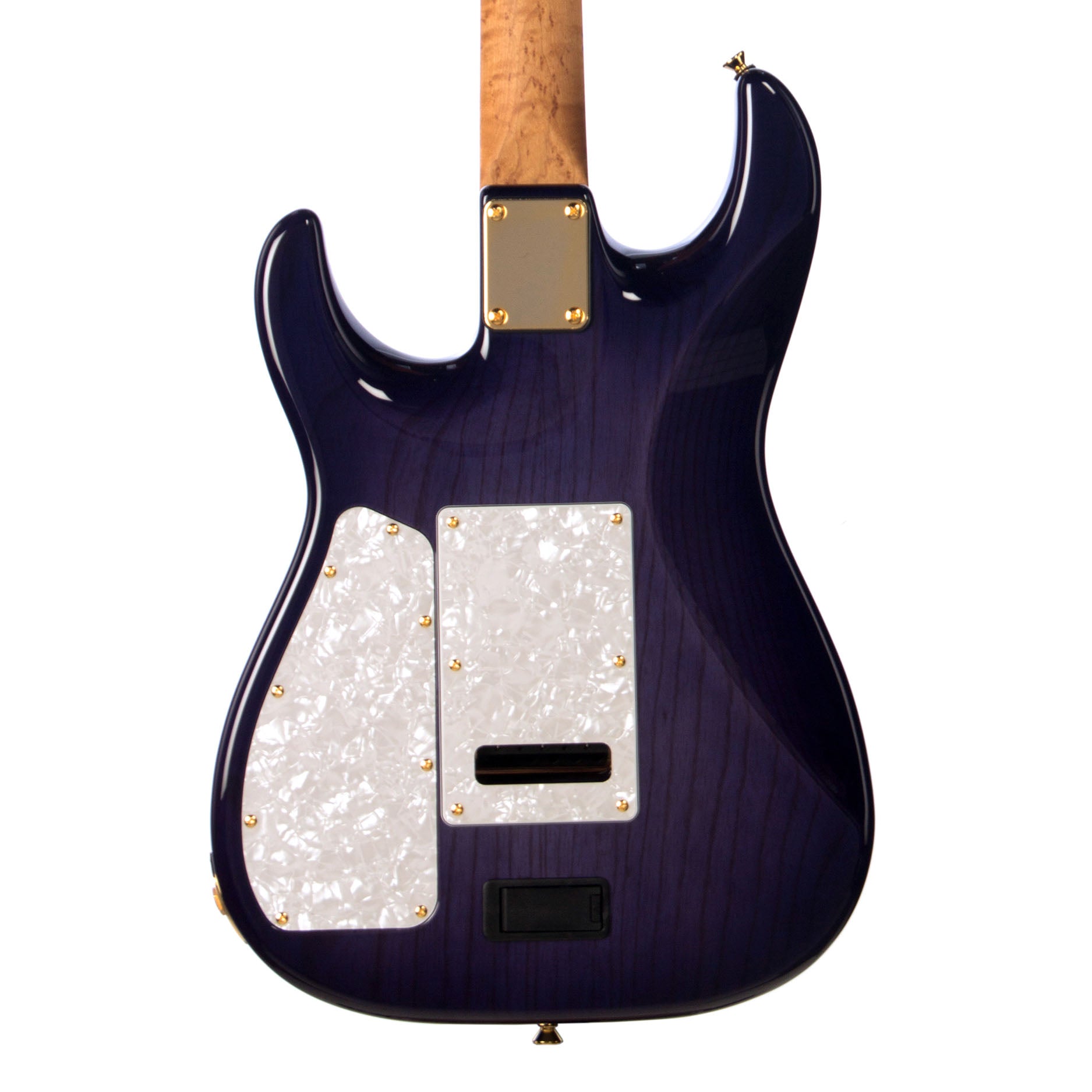 The Studio Elite HD is a full custom boutique electric guitar. On this one we requested a slanted HSS pickup compliment with a rear routed configuration. The body is lightweight Ash with a beautiful Quilted Maple top and the neck is Roasted Birdseye Maple. We've also spec'd some very cool Lapsis Gold (purple) inlays and a classic Headstock. NOW - Can we talk about this finish? What a killer new color!!! It's "Amethyst Fade" with a complimentary trans purple burst back. Extremely classy looking (in an expensive call girl kind of way), and like that expensive call girl, this guitar has all the tricks - Versatile wiring with Midboost Preamp and Bypass button, 3x Series/Parallel buttons, and a P/P Tone Control for Add Bridge+Neck is also included. It doesn't get better than this (oh wait, it does! Did I mentioned it's only 6lbs, 4oz)!!!