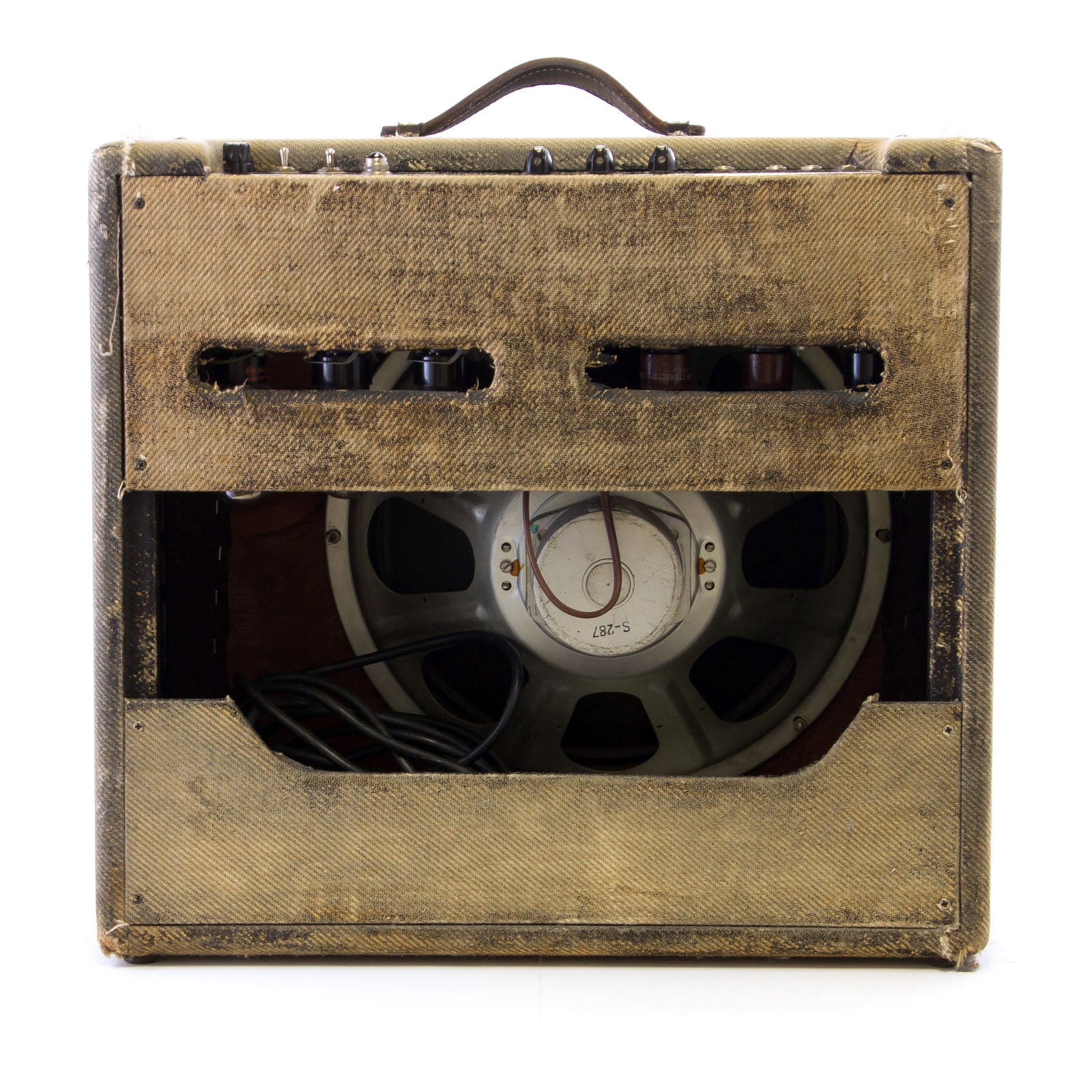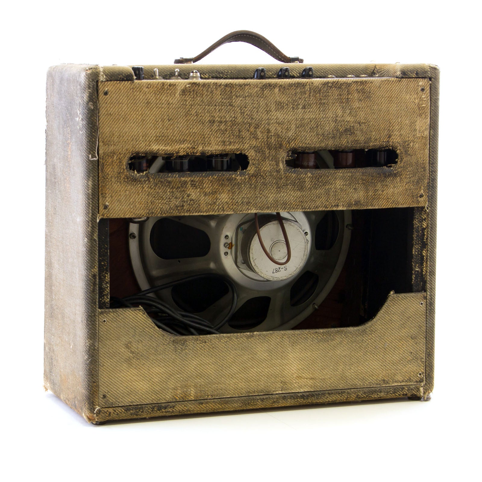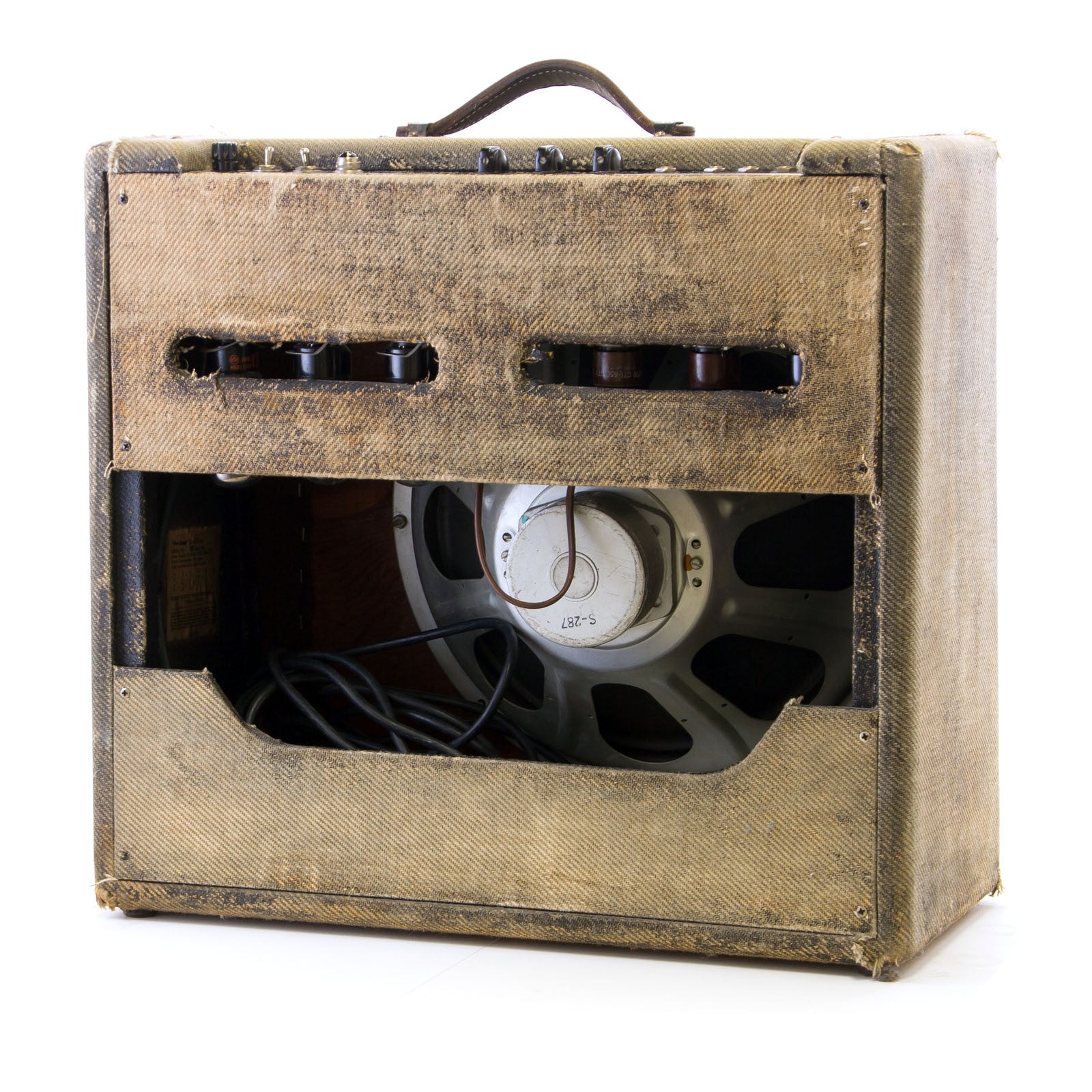 The amp looks rough, but it's actually pretty straight and original. The main issue is that someone once painted the tweed black and then a later attempt to remove the black paint left it looking rather tattered on the outside. The tweed is original, although the grill cloth may have been changed. The power cord has been switched to a 3-prong and the speaker was replaced at some point with a vintage Magnavox. Other than that, and the aforementioned black paint to the best of my knowledge the amp is all stock.