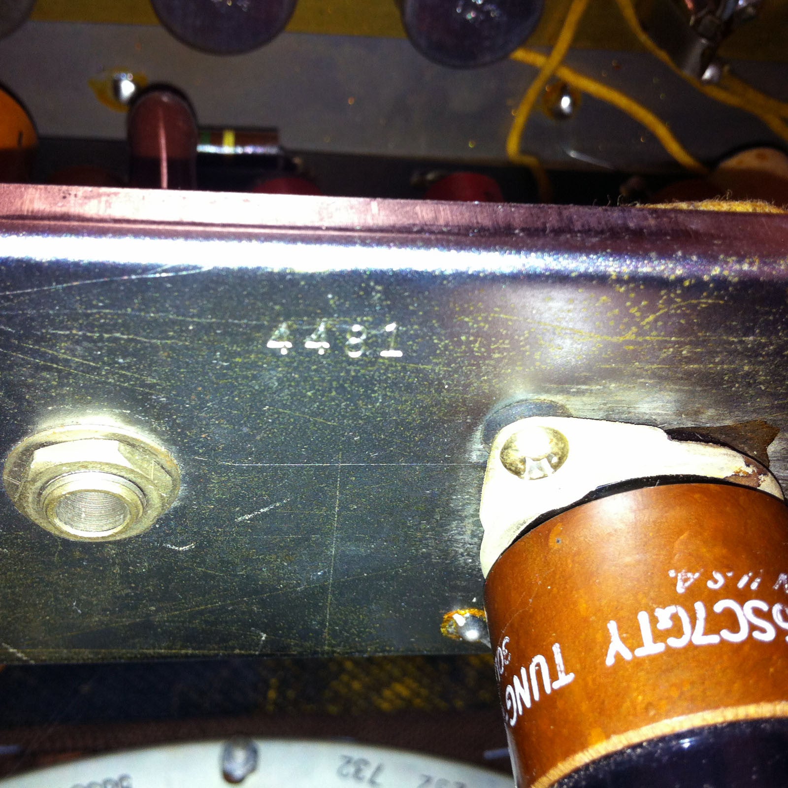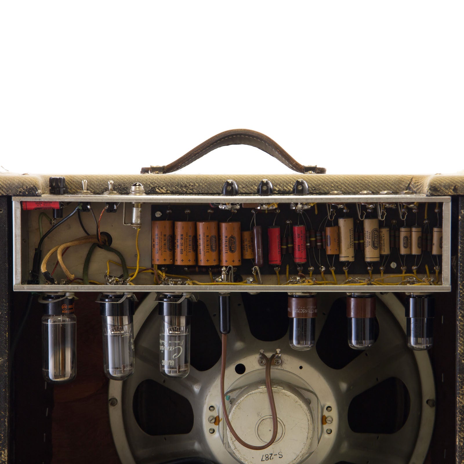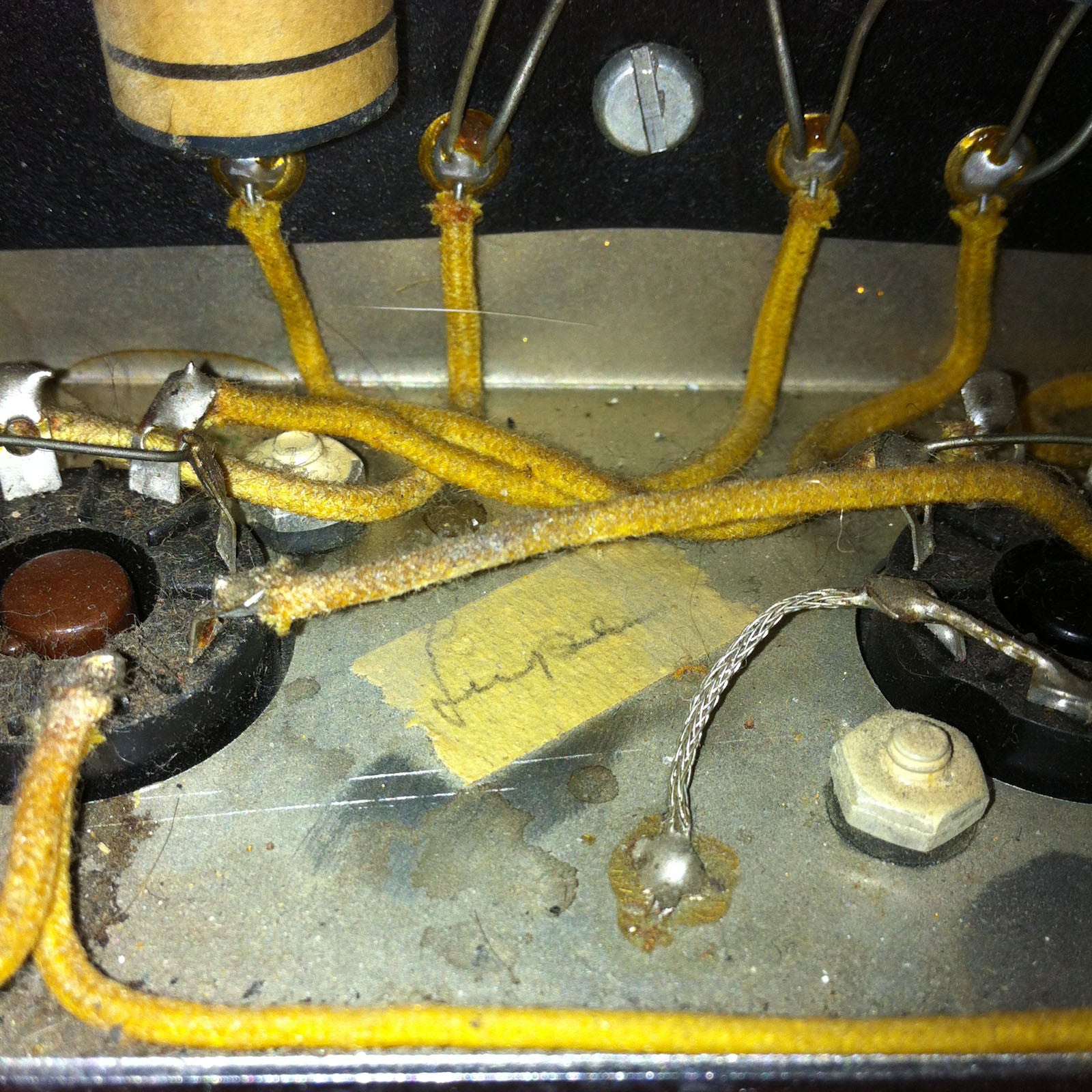 The amp looks rough, but it's actually pretty straight and original. The main issue is that someone once painted the tweed black and then a later attempt to remove the black paint left it looking rather tattered on the outside. The tweed is original, although the grill cloth may have been changed. The power cord has been switched to a 3-prong and the speaker was replaced at some point with a vintage Magnavox. Other than that, and the aforementioned black paint to the best of my knowledge the amp is all stock.