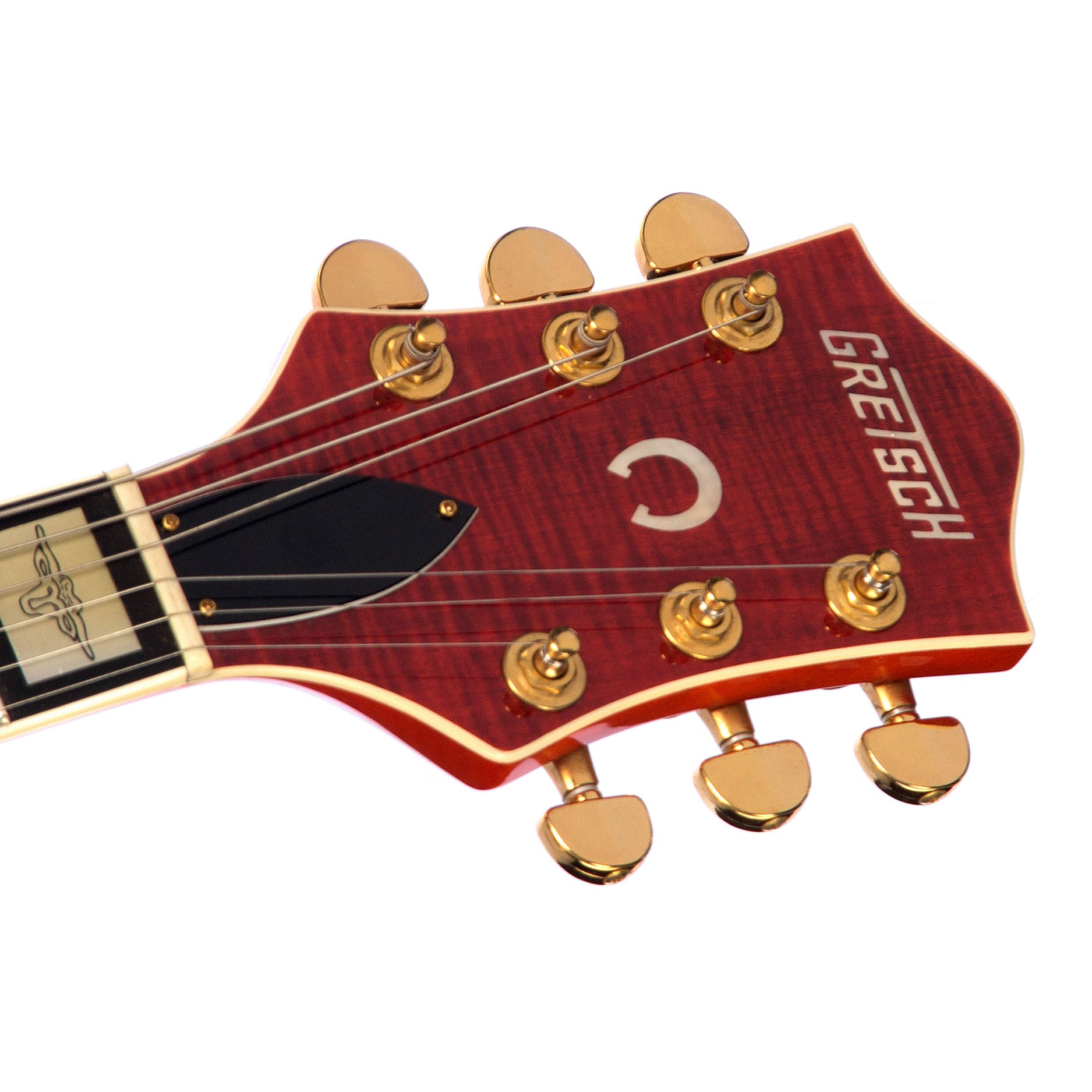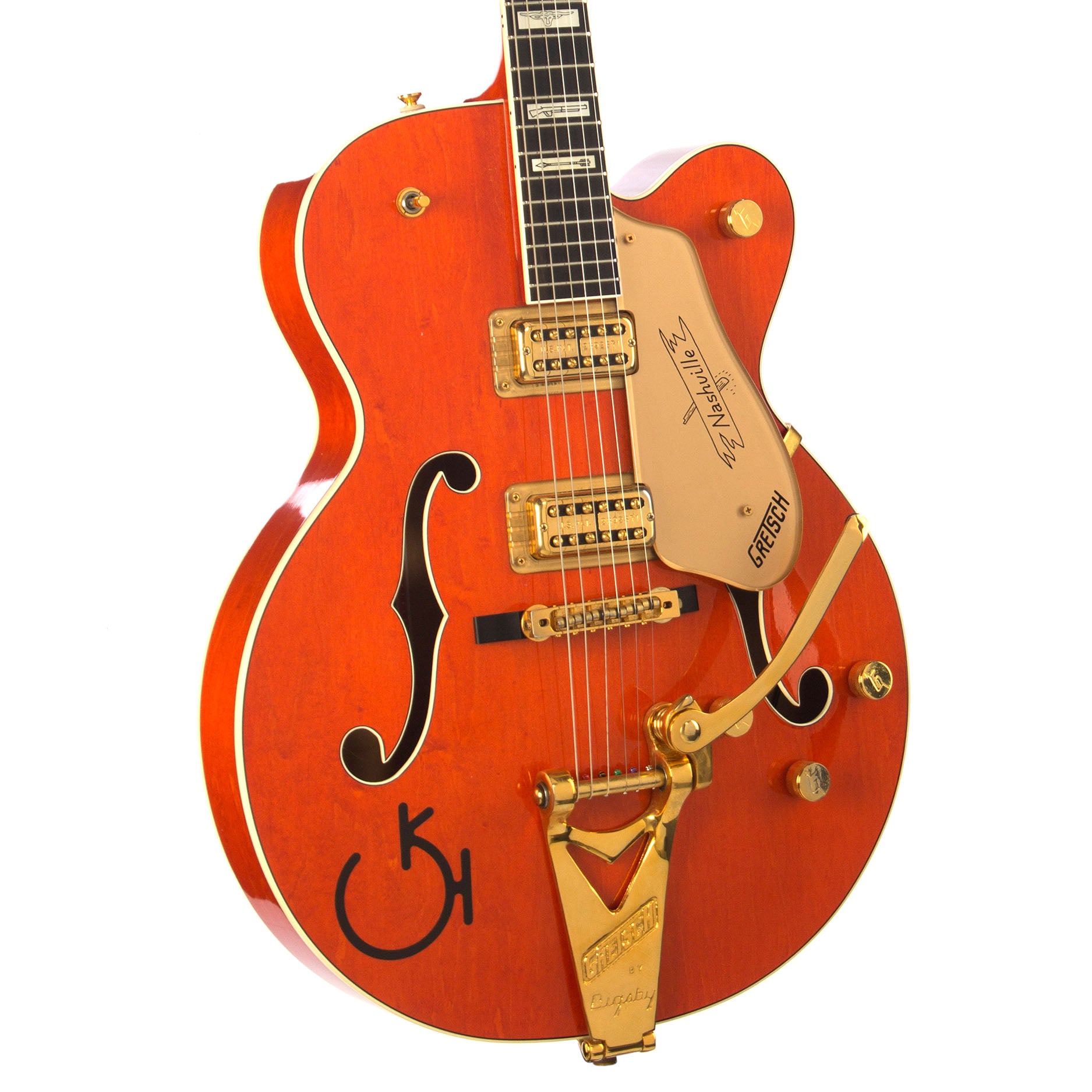 Used! Just in on consignment! This 1994 Gretsch 6120W Nashville is one fine machine! Made in Japan. It has the classic “Western” styling motif inlaid up the fingerboard with plenty of Cactus’, Cows, Guns and Arrows. It is similar to the guitars Chet Atkins made popular back in the 1950’s and 1960’s and features Hollowbody Maple construction with a slim, comfortable Maple neck, Ebony fingerboard and 22 frets. A pair of Filter'Tron humbuckers serve up the tone, while a Bigsby tailpiece delivers charismatic vibrato. The classic Gretsch Orange finish is complimented by the “G-brand” logo on the body, Gold pickguard, "G" arrow control knobs, and a set of aforementioned Western-themed Pearl inlays to add elegance.