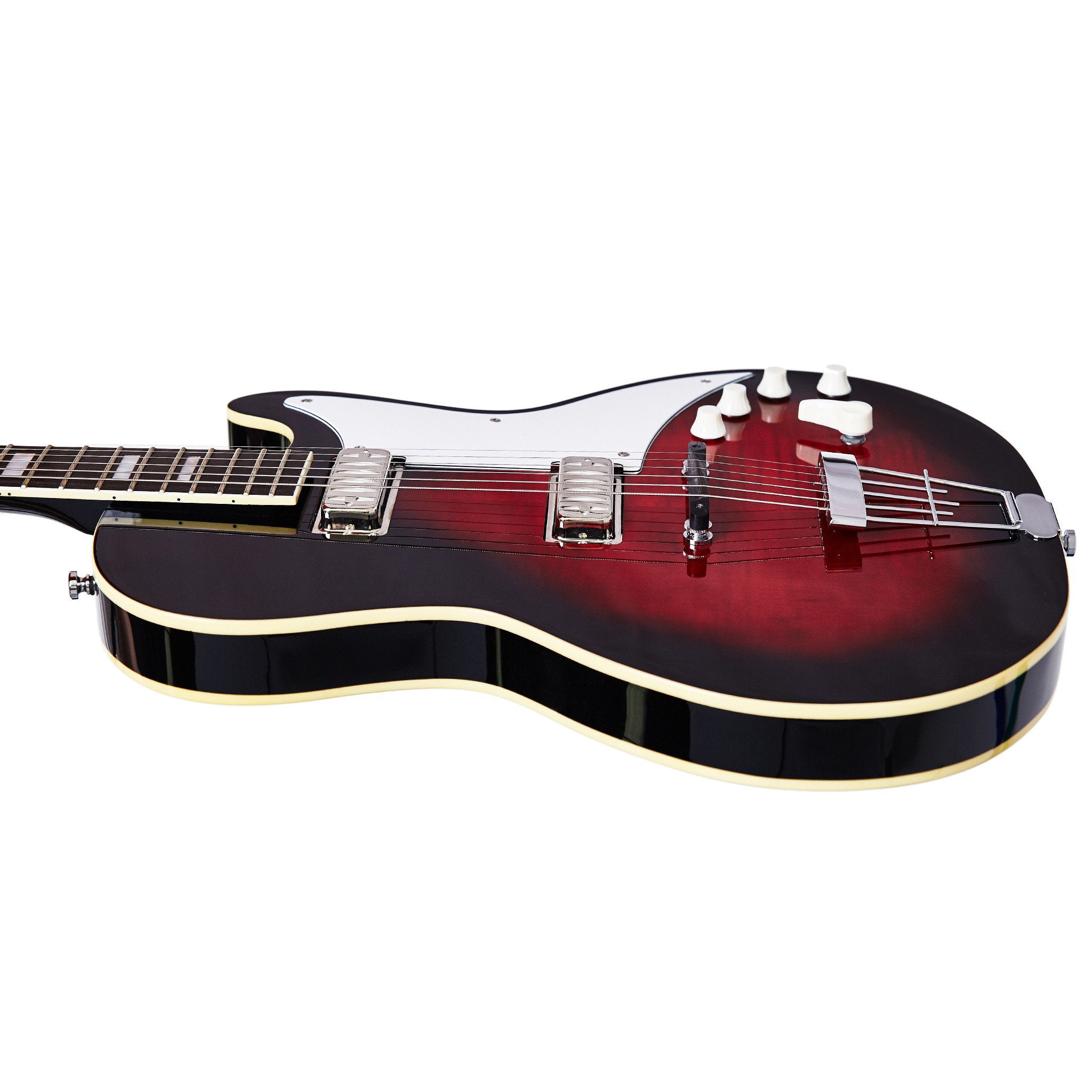 Be inspired by the late 1950's Silvertone Jupiter with the Airline Jupiter Redburst guitar. The Jupiter features a hollow body design with maple top, back, and sides, along with a bolt-on neck and bound fingerboard for maximum tonal versatility. Its 26" scale contributes to a resonant and punchy tone while the ARGYLE pickups produce a vintage 50's/60's sound. The tone is reminiscent of many early electric guitars from the 50's and 60's, capable of producing clean or distorted tones without feedback. Like all the Airline reissue and tribute model guitars, the Jupiter captures the vibe of a vintage guitar while offering superior playability and functionality due to improved construction specifications and upgraded hardware.
