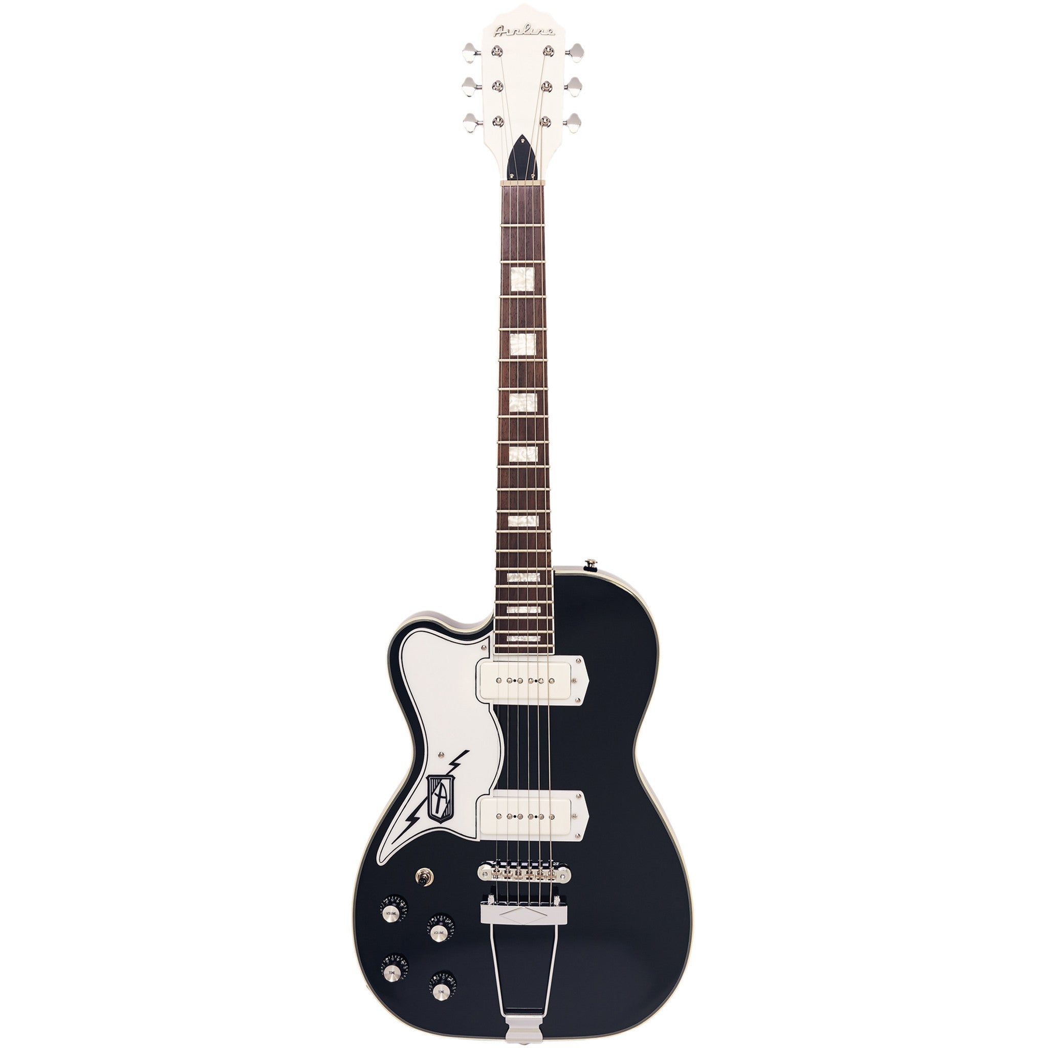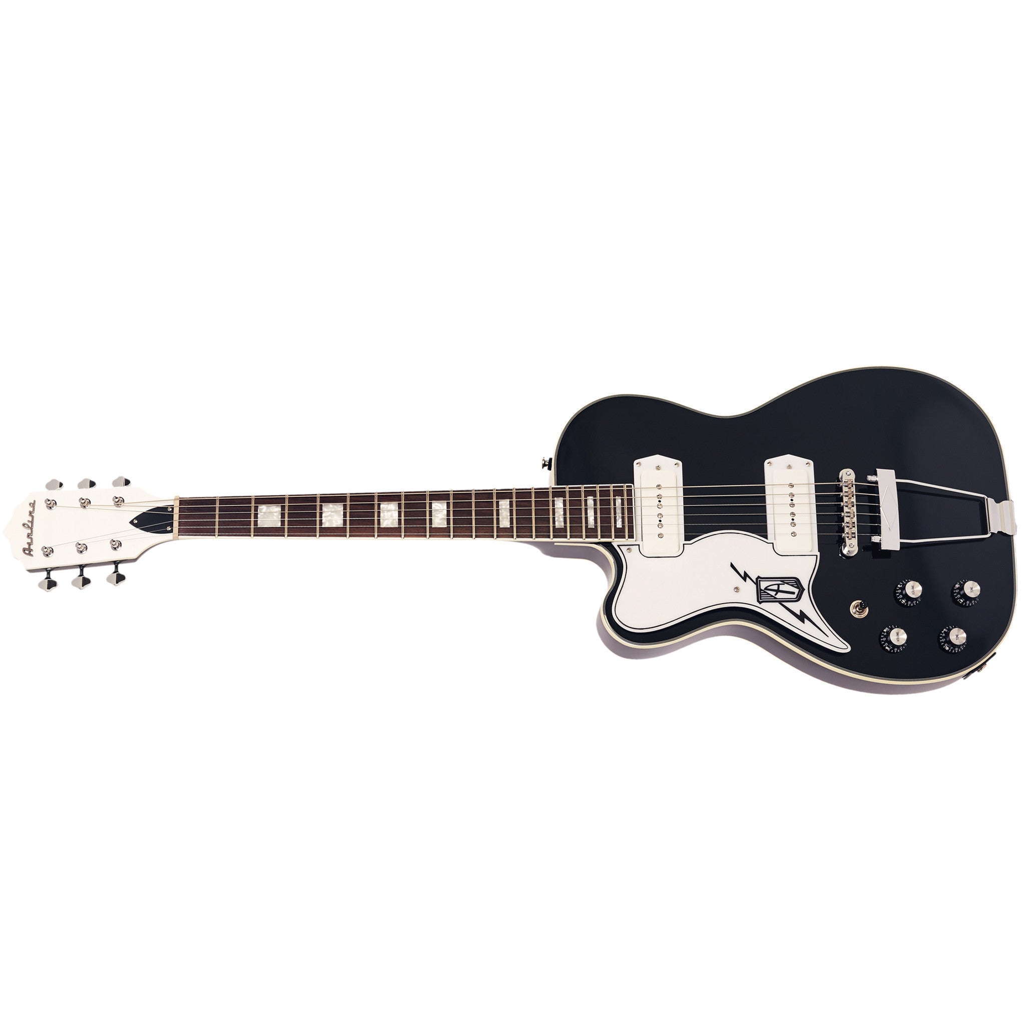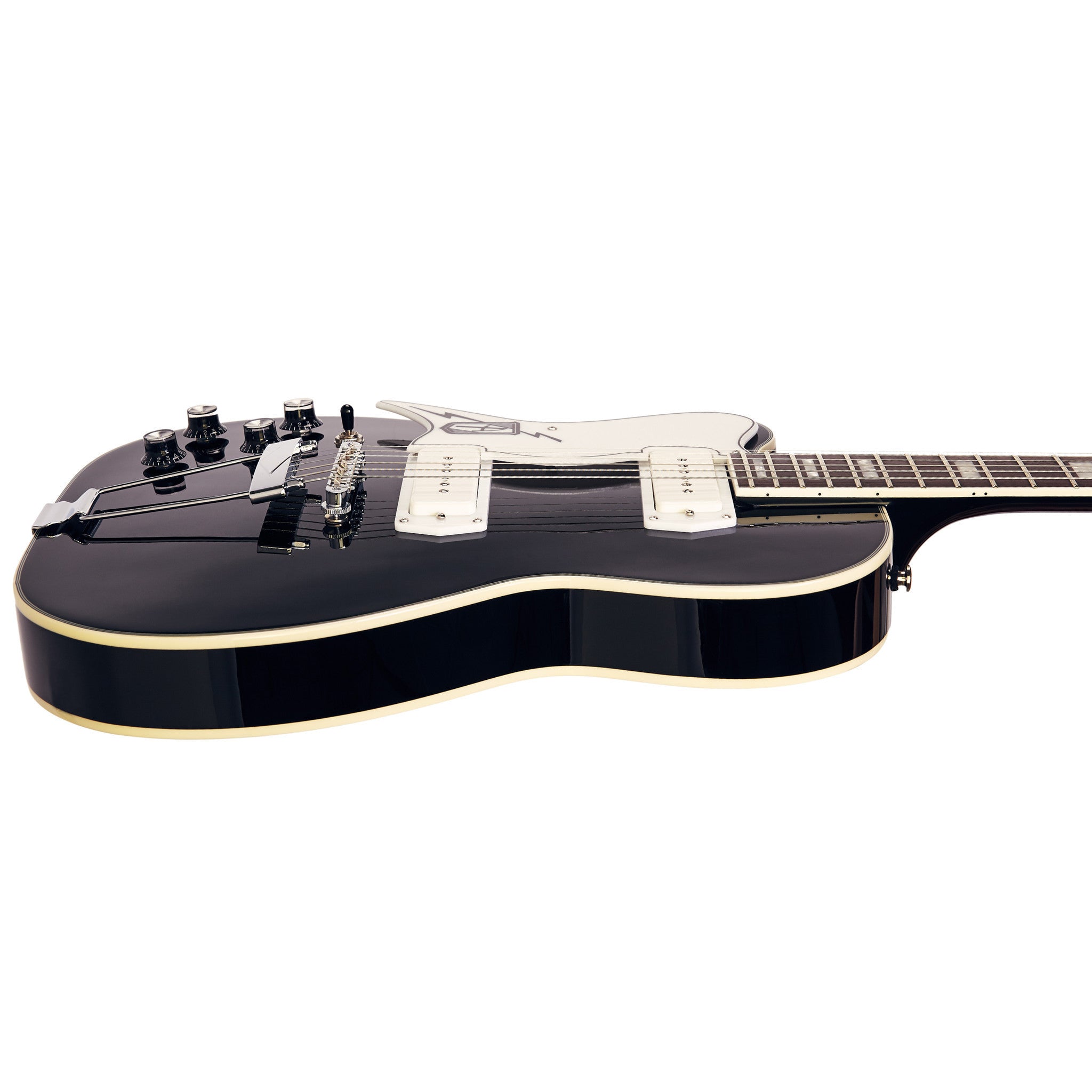 The Airline Tuxedo Hollowbody Electric Guitar is a tribute to the 1950s Barney Kessel signature model, with a fully hollow body and a solid Mahogany center section for a versatile tonal range. With a set neck and bound fingerboard for optimal playability, its pearloid block marker inlays, 25 1/2" scale length, and 1 11/16” nut width provide a comfortable and professional experience. Equipped with two custom Hi-Output P-90 pickups, 3-way switching, and dual volume/tone controls, this guitar has the versatility for any musical style. Chrome hardware, a Tune-O-Matic bridge, trapeze tailpiece, and vintage style open back tuners add to its sleek appearance.